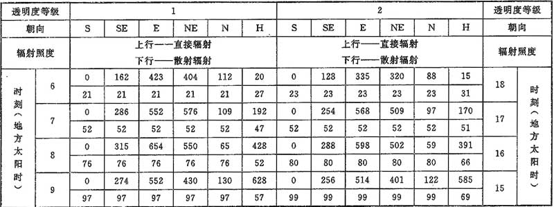 D.0.1 計算夏季空調冷負荷時,透過建筑物各朝向垂直面與水平面標準窗玻璃的太陽直接輻射照度和散射輻射照度應按表D.0.1-1~表D.0.1-7采用。
