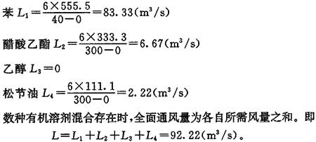 算例:某車(chē)間使用脫漆劑,每小時(shí)消耗量為4kg。脫漆劑成分為苯50%,醋酸乙酯30%,乙醇10%,松節(jié)油10%,求全面通風(fēng)所需的空氣量。