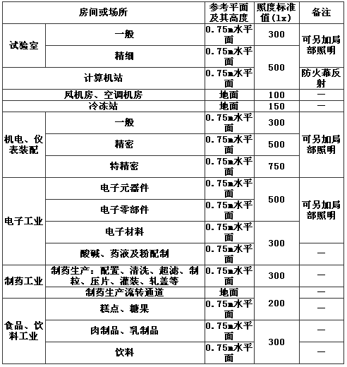 表11中的電子工業、制藥工業、精密加工、食品工業等的照度值均在本條規定的200lx~500lx范圍。本次修訂本條改為推薦性條文。